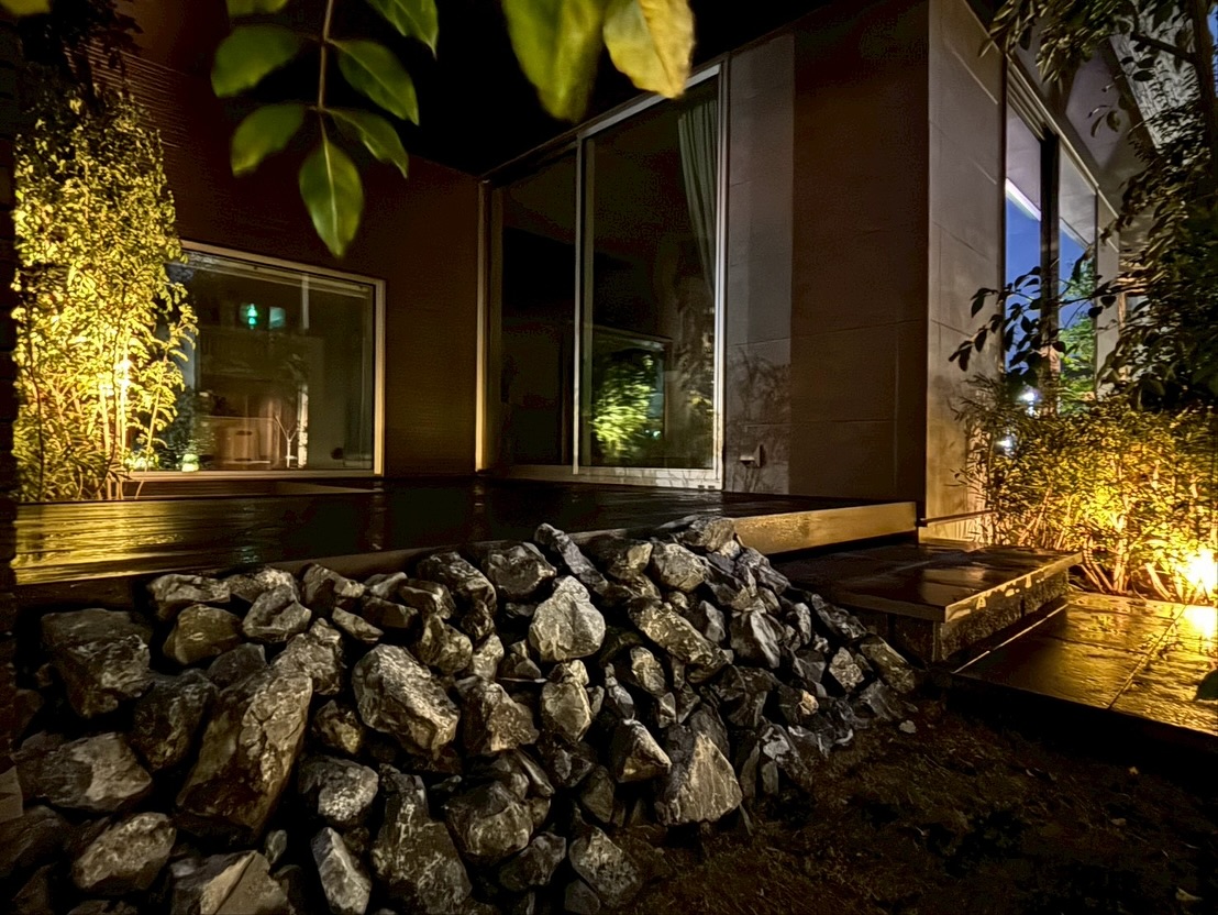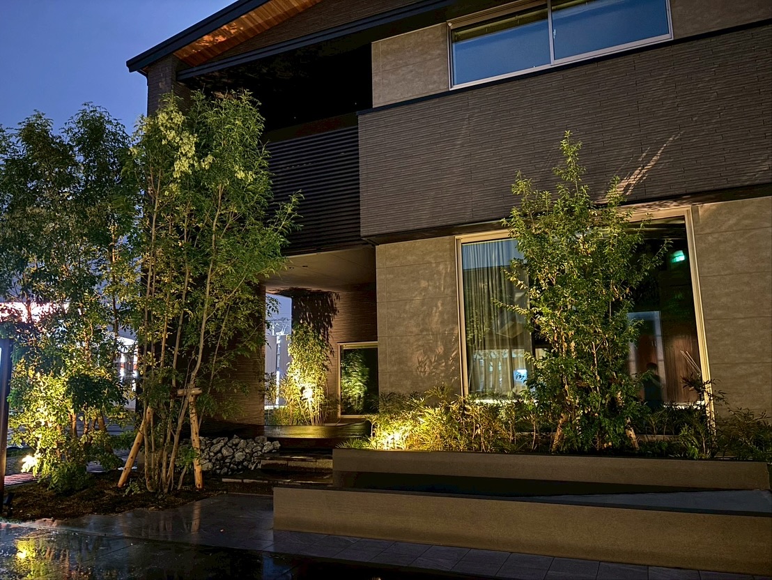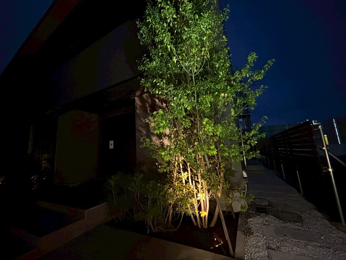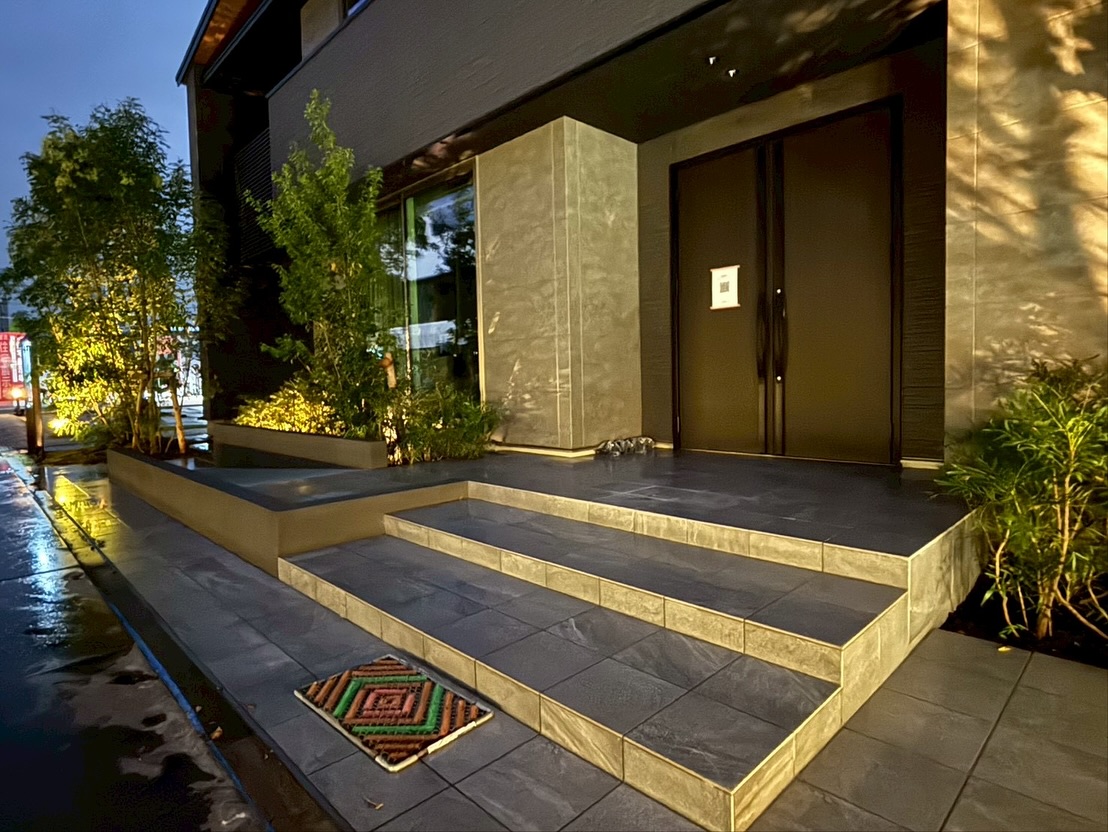 夜間の照明の使い方や、植栽配置、グリ石の置き方、タイルの割り付けなどこだわらせて頂きました😊